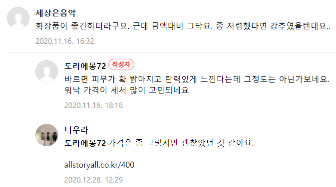 종합적으로 보면 피부에 투자를 아끼고 싶지 않은 분들은 써보셔도 좋을 것 같네요. 그리고 피부과 가는 게 낫다고 하시는 분들도 계시는데, 애초에 화장품과 병원을 같은 선상에서 보는 건 에러이지 않을까요?