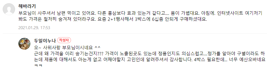 쇼핑몰 후기가 아닌 관련없는 카페 등에서 광동 침향환 후기를 찾아봤는데요, 섭취 후 몸이 가벼워 졌다는 후기가 좀 있습니다. 아무리 좋은 성분이 들어간 침향환이라도 꾸준히 섭취해야 효과를 볼 수 있지 않을까 싶습니다.