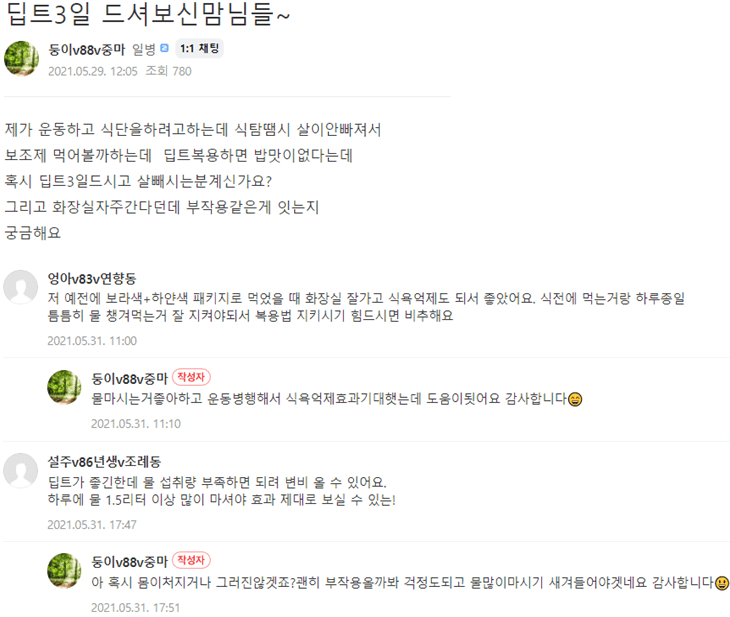 다들 아시겠지만 쇼핑몰 안의 후기는 신뢰성이 없어서 맘카페 같은 커뮤니티에서 찾아봤습니다. 일단 딥트3일 후기를 보시면 공통적으로 식욕억제에 효과가 좋다고 하며, 효과도 생각보다 쏘쏘 하게 있는 것으로 보입니다.