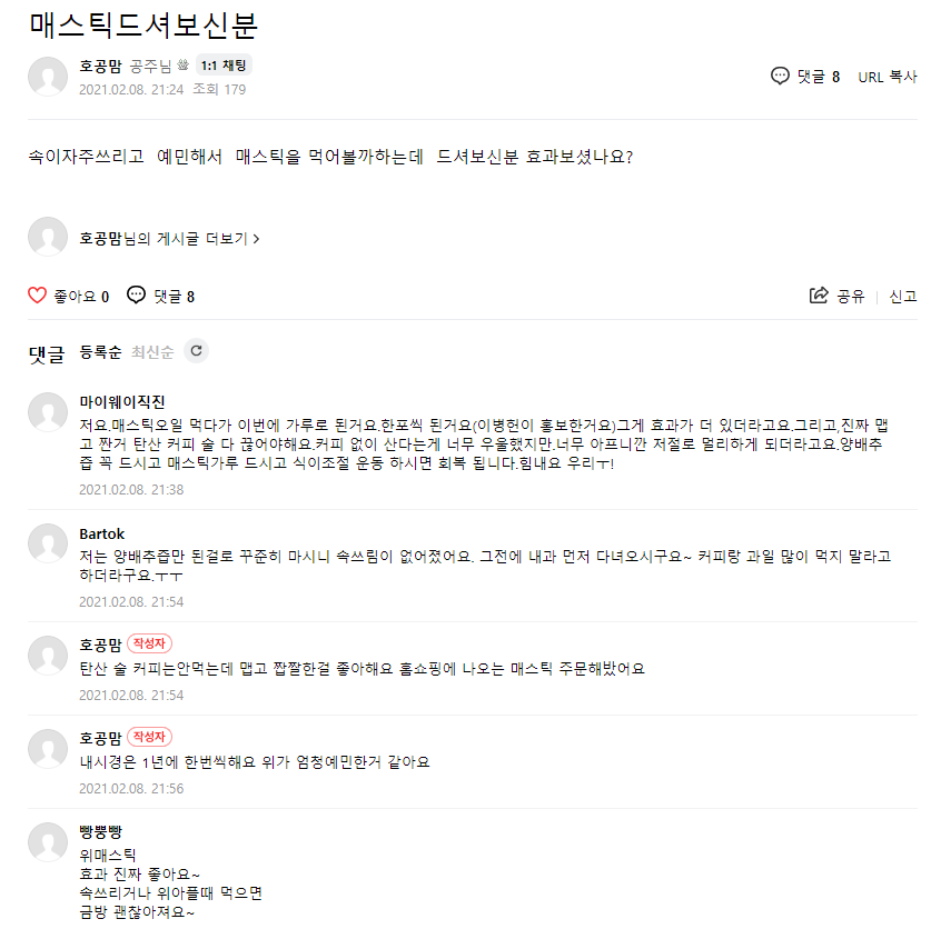 매스틱 오일보다 효과가 좋으며, 양배추 즙까지 드시면 더 좋다는 후기가 있습니다.