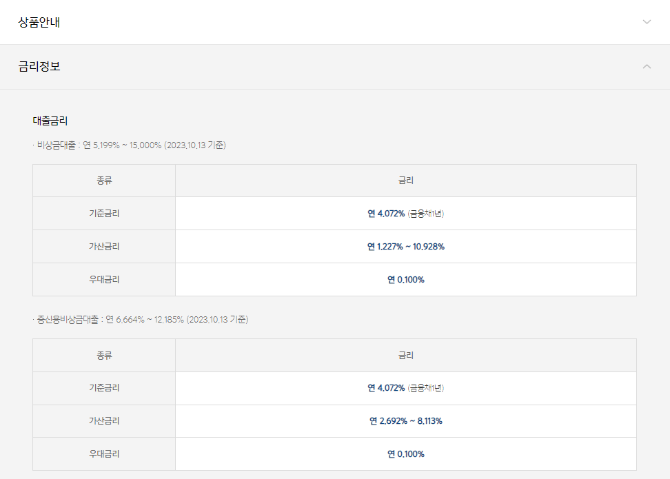 최근에 국채와 금융채가 많이 뛰어 2023년 10월 13일 기준 비상금대출 이자는 연 5.199%부터 시작하네요. 매일 변동되오니 실시간 금리는 카카오뱅크 비상금대출 홈페이지 하단 '금리정보'에서 확인 가능합니다. 중신용자의 경우 더 높은 가산률이 적용됩니다.