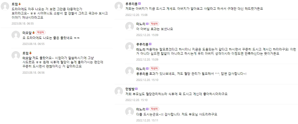 꾸준히 섭취 후 식후 혈당 쪽에 효과가 있는 것 같다는 후기가 많습니다. 재미있는 부분은 워낙 어르신들 사이에서 유명하다 보니 선물 자체로도 만족도가 높은 것 같습니다.