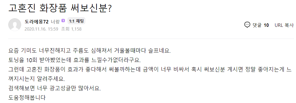 고혼진 후기를 찾아봤는데요, 광고가 워낙 많다보니 주작 말고 솔직 후기 찾는데도 힘들었습니다. 재미있는 점은 고혼진 화장품 가격이 비싼 만큼 효과가 좋긴 하다는 평이 많습니다. 그런데 솔직히 이 가격에 효과까지 없으면 난리 나지 않을까 싶습니다. 이렇게 오랫동안 판매되려면 당연히 기본기는 되어야겠죠.