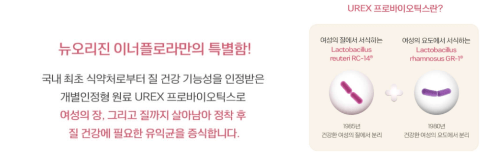 UREX 프로바이오틱스를 원료로 대한민국 최초로 질 건강 개선 기능성을 식품 의학 안전처로부터 인증 받았다고 합니다.