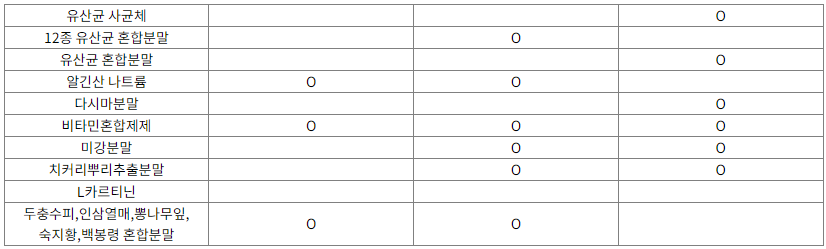 부원료는 제품마다 조금씩 다르기 때문에 아래 표를 참고하시기 바랍니다.