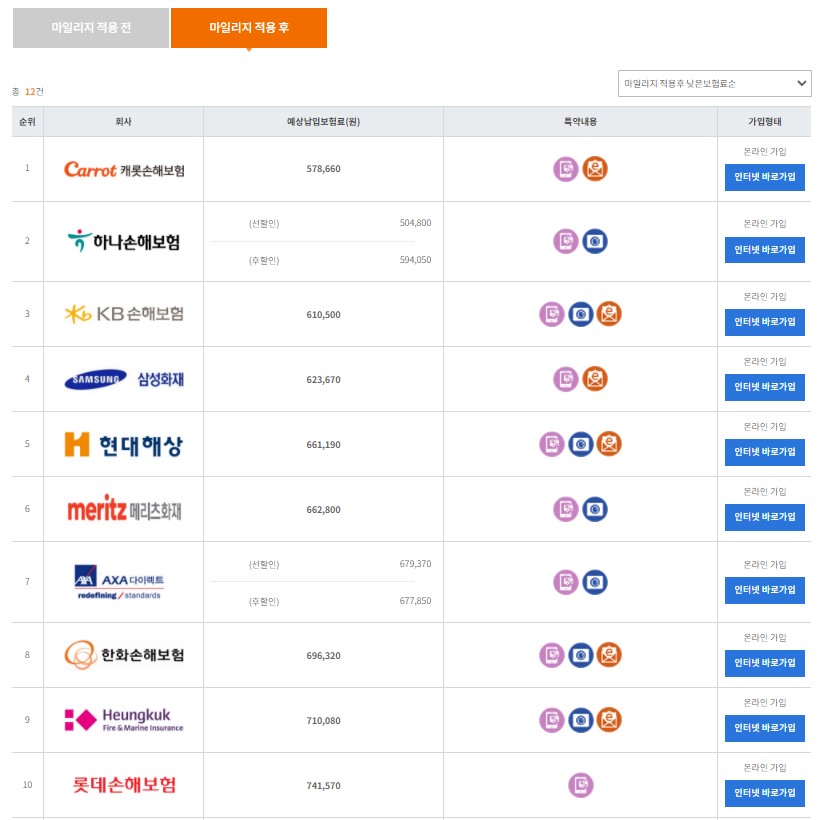 자동차보험료 계산 결과를 보시면 마일리지 전후로 나뉘어 있습니다. 마일리지를 적용한다면 캐롯이 최상단에 있지만 위에서 언급했지만 저는 주행거리가 극단적으로 짧지 않으므로, 배제했습니다.